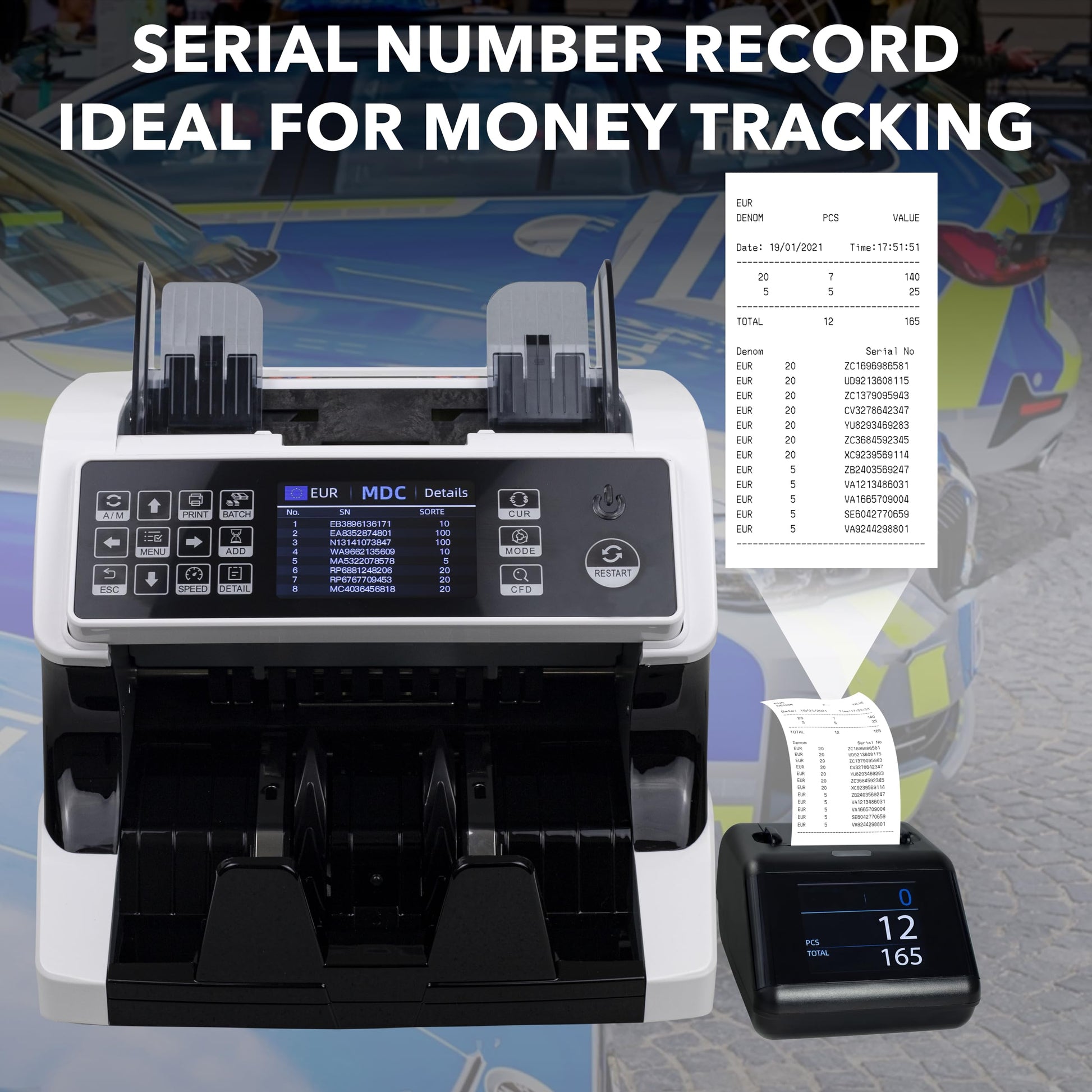 - ✅ Enorme Zeitersparnis: Der Banknotenzähler zählt gemischte Stückelungen und meldet den Gesamtwert, eine klare Aufschlüsselung von Menge und Wert nach Stückelung und Seriennummer. Außerdem unterstützt sie die Zählung von Werten in mehreren Währungen (EUR, USD, GBP, UAH, SEK, CHF, DKK, PLN, CZK, HUF). Mit dem Jubula MPR-1 kannst du sie alle ausdrucken. Ideal für kleine Unternehmen, Tankstellen, Polizeidienststellen und Banken. Zertifiziert von der Europäischen Zentralbank.