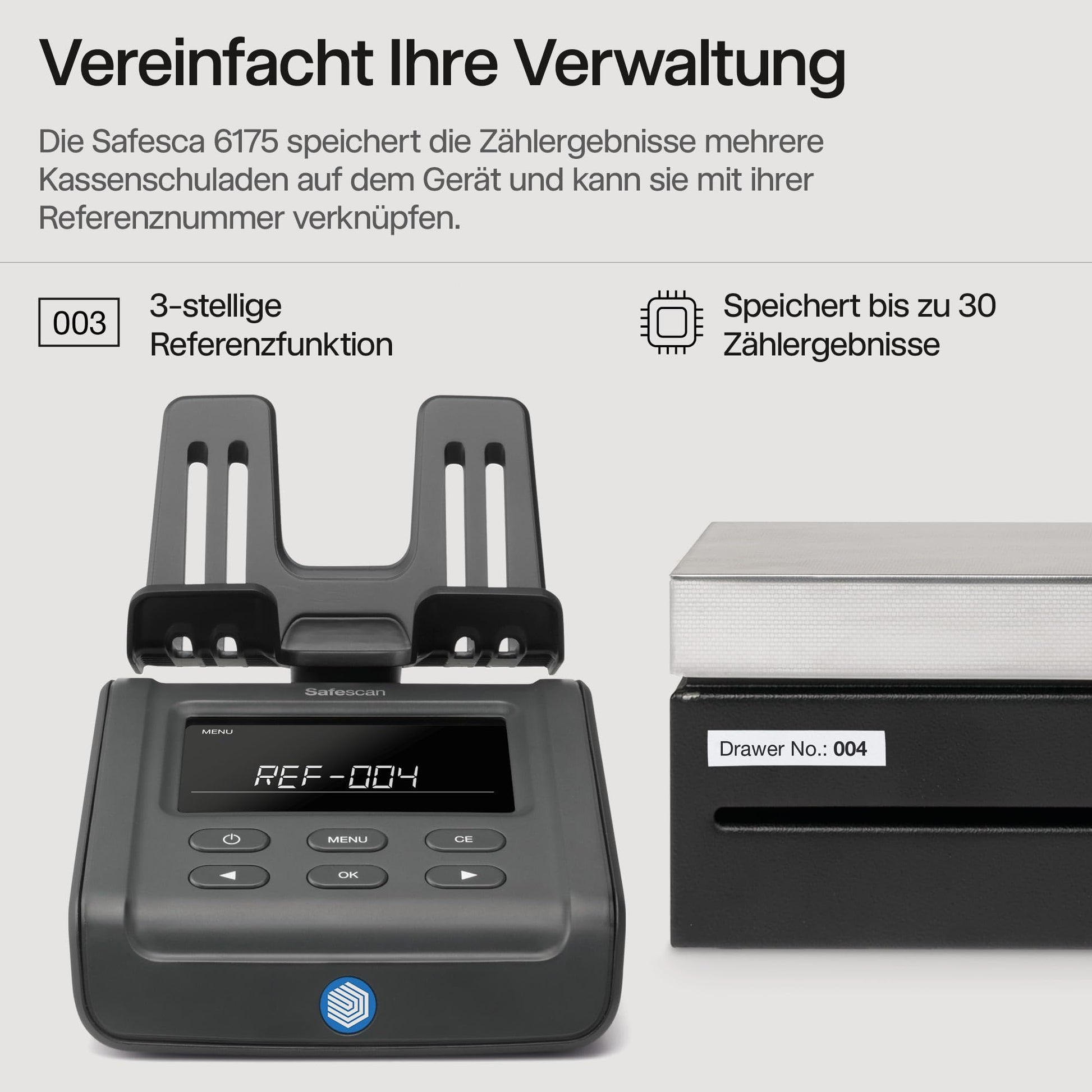 - EINFACHES CASHMANAGEMENT: Müssen Sie mehrere Kassenschubladen verarbeiten Kein Problem! Auf dem Safescan 6175 können Sie die Ergebnisse verschiedener Zählsitzungen oder Kassenschubladen einfach speichern. Sie können sie sogar mit ihrer eigenen persönlichen Referenznummer verknüpfen, sodass Sie immer wissen, welches Ergebnis zu welcher Kassenschublade oder Mitarbeiter gehört.