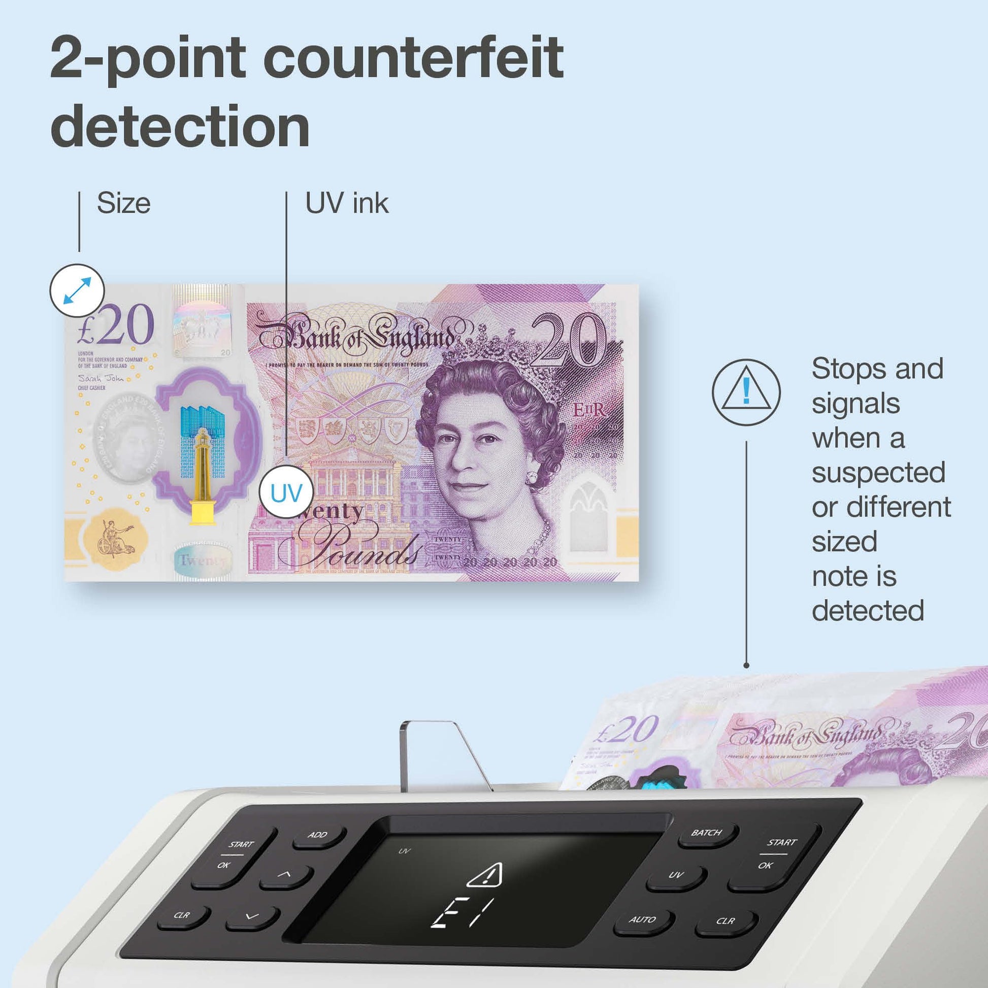 - Die Safescan Geldzählmaschine 2210 ist ein unverzichtbares Hilfsmittel für Unternehmen und Privatpersonen, die großen Wert auf effizientes und präzises Zählen von Geld legen. Mit ihrer 2-fachen Falschgelderkennung bietet sie eine zuverlässige und genaue Zählung, die auf UV-Markierungen und Geldscheingröße basiert.